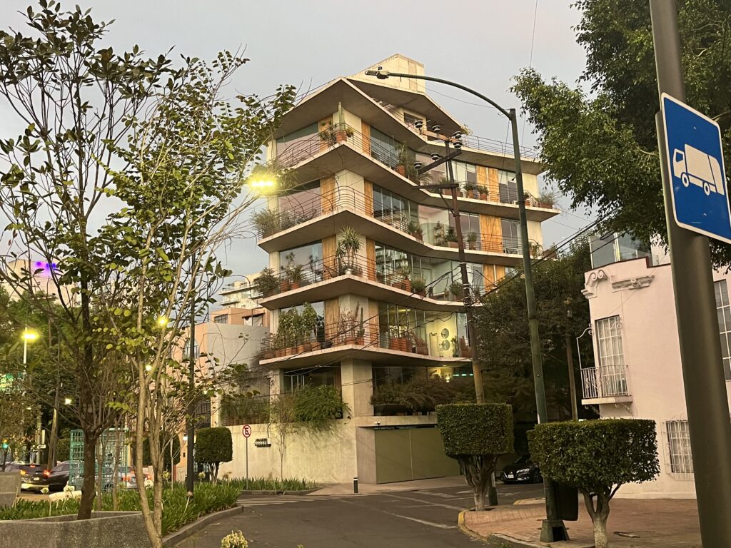 On Avenida Chapultetec, the sun is setting, and the Chapultetec forest to our left is dark. Workers waters the trees and the grass with green garden hoses. Fallen trees are on the ground. There are patches of grass, playgrounds for children and paths for joggers, but it couldn’t be more different from the English Gardens that dominate American city parks. The trees are young, but tightly spaced, making for a dense canopy in the middle of this desert metropolis. We can’t go in because it is getting dark, so we turn our eyes to the buildings to the right.